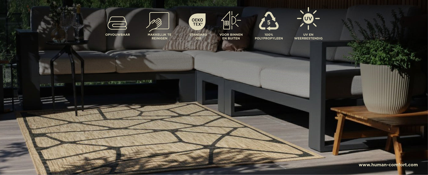 Het kleed is gemaakt van 100% UV-bestendig polypropyleen en geschikt voor buitengebruik onder wisselende weersomstandigheden. Het materiaal is licht, opvouwbaar en eenvoudig schoon te maken, waardoor het praktisch is voor dagelijks gebruik op de camping of in de tuin.